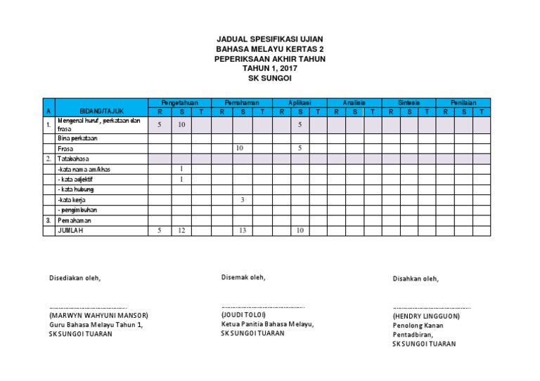 Contoh Jadual Spesifikasi Ujian UPSR. Ujian Bulanan Bm Tahun 3 Kertas 1. Kertas 1 Bil Bentuk Soalan - Objektif Topik Aspek Bahasa Morfologi Kata kerja Kata nama am an khas Kata ganti iri Kata a jektif Kata seru Kata sen i Kata hubung Imbuhan Kata arah enjo oh bilangan Simulan bahasa Sinonim Antonim Kata tana omonim Kata banak makna.